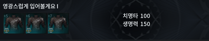 3) 영광스럽게 입어볼게요 1 : 치명타 100 / 생명력 150
